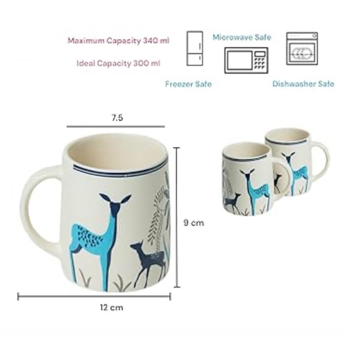 Jhaji Ceramics Adventure Edition Coffee & Tea Mugs | Modern Art Design with Deer and Floral Print | Set of 2 (White, 250ml)