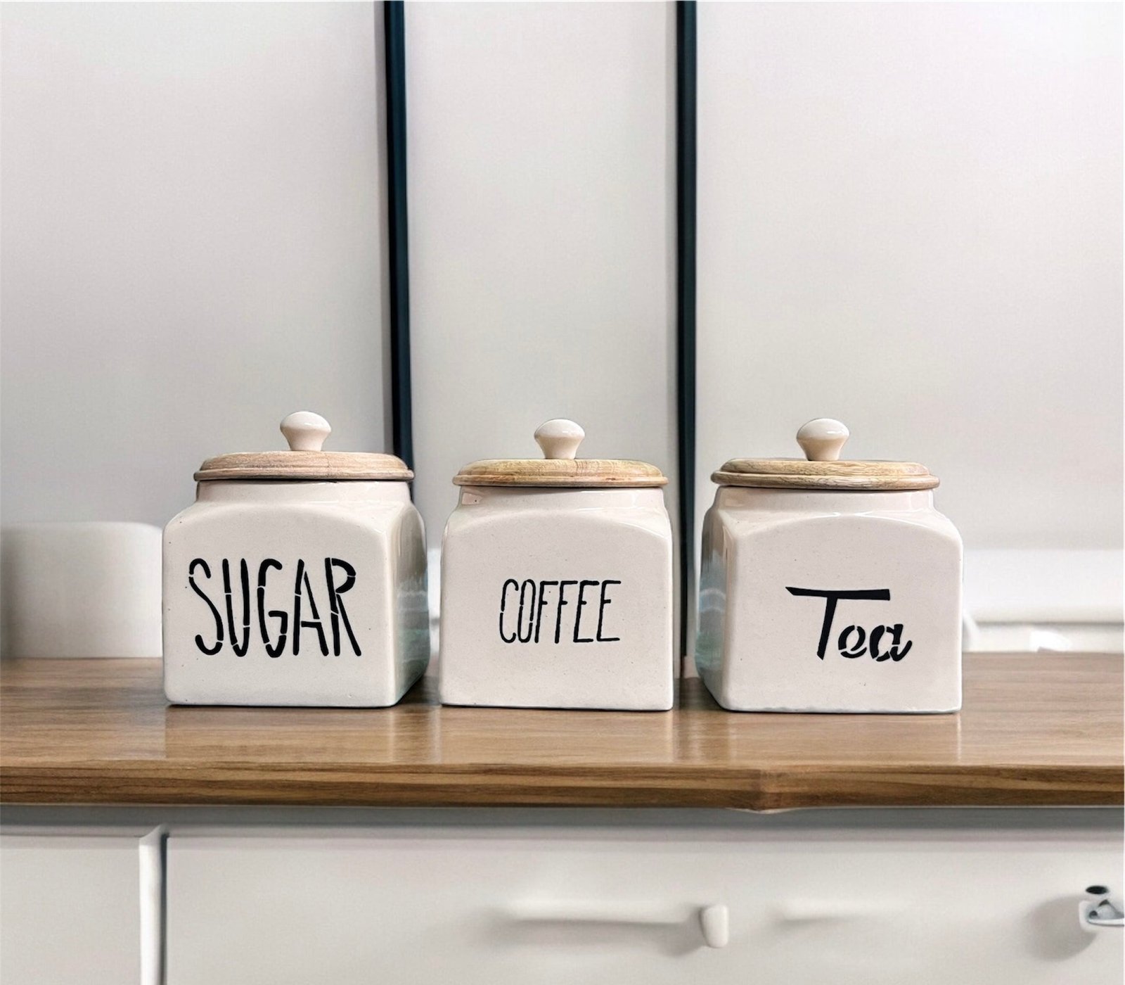 • Set of 3 Canisters: Includes one canister each for Tea, Coffee, and Sugar, each with a functional and elegant design.