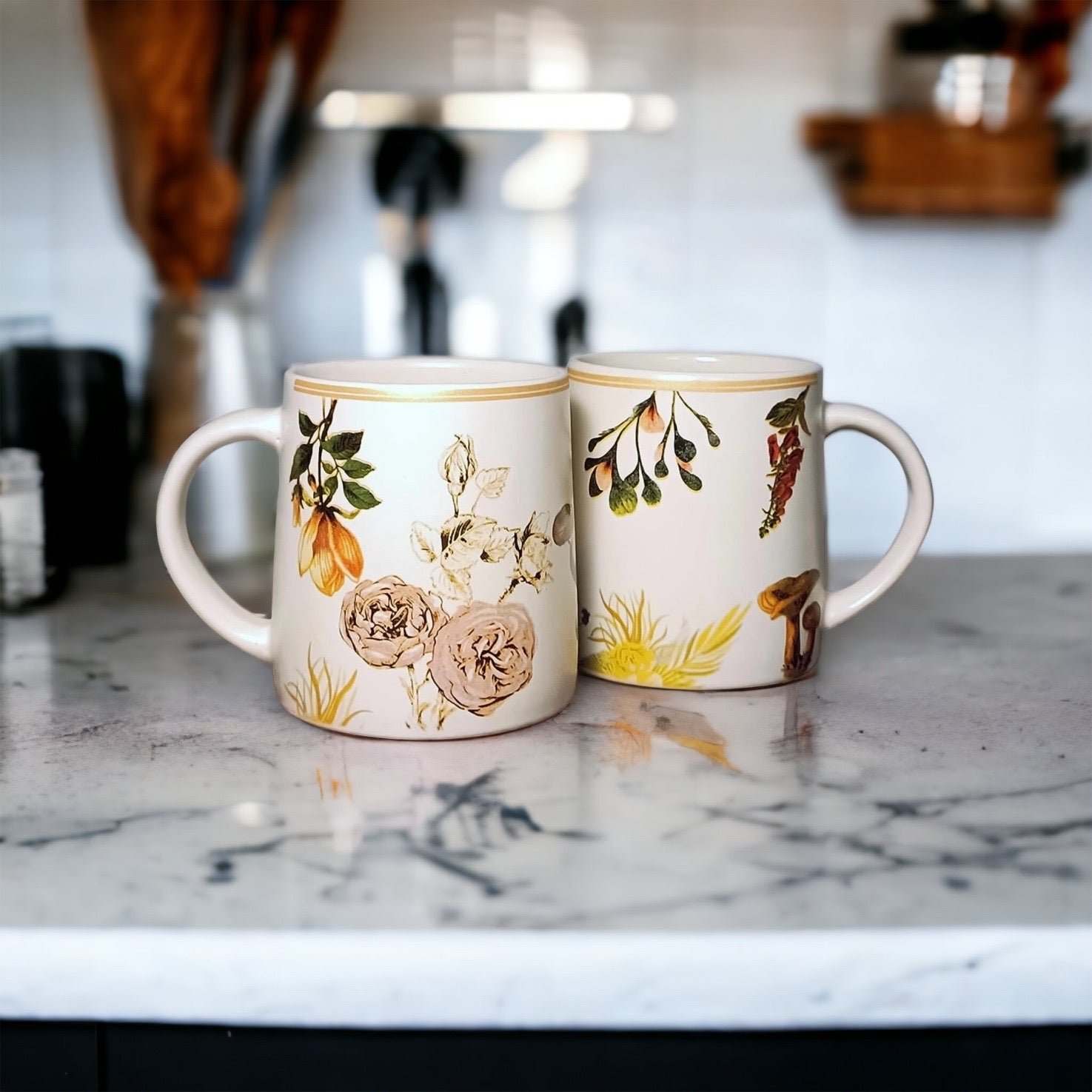 The set includes two ceramic mugs, each featuring a unique and vibrant floral design. The delicate details and soft hues create a visually appealing ensemble that complements any kitchen or coffee nook. Sip your favorite brew in style as you immerse yourself in the subtle beauty of these floral prints.